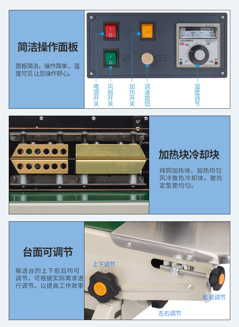接通電源后,傳動機構開始工作,帶動輸送裝置和封口印字機構運轉。同時,加熱元件通電升溫,當裝有物品的包裝被放置在輸送帶上,袋的封口部分被自動送入運轉中的封口帶之間,并帶入加熱區,加熱塊的熱量通過封口帶傳輸到袋的封口部分,使薄膜受熱熔軟,再通過冷卻區,使薄膜表面溫度適當下降,然后經過滾花輪或印字輪滾壓,使封口部分上下塑料薄膜粘合并壓制出網狀花紋或印制標志,最后由導向橡膠帶與輸送帶將封好的包裝袋送出機外,完成封口作業2.
