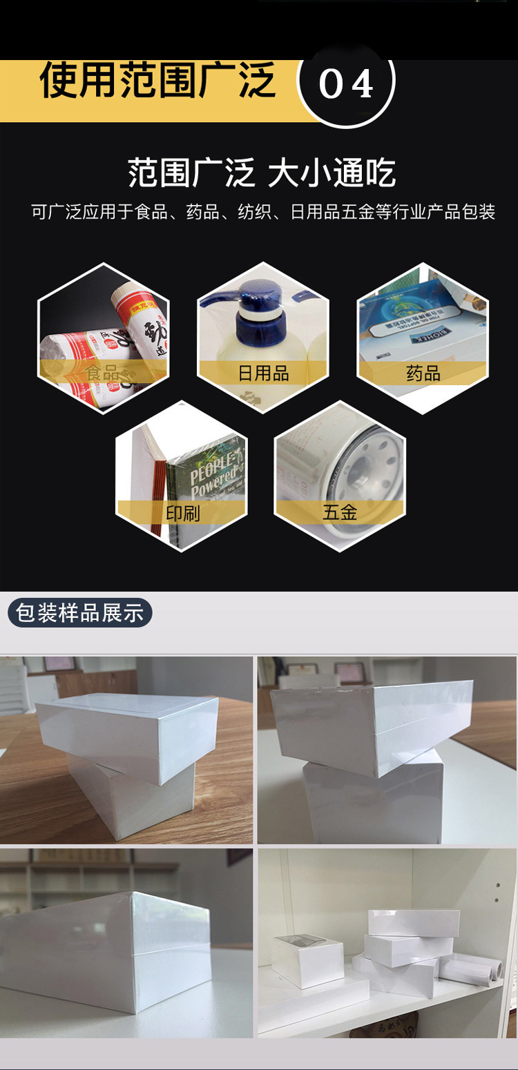 - 美觀的外觀:封切后的封口整齊、平滑,收縮后的薄膜貼合緊密、無褶皺,使產(chǎn)品包裝具有良好的外觀效果。在包裝消費(fèi)品,如食品、日用品、化妝品等時(shí),美觀的包裝可以提升產(chǎn)品的吸引力和品牌形象。