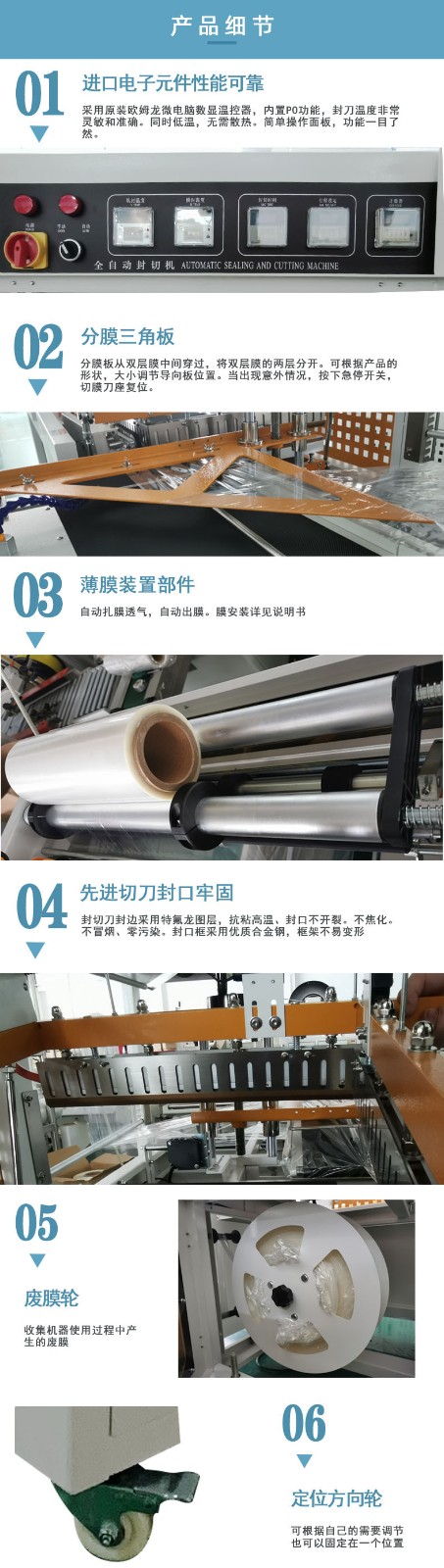 - 由封刀、切刀、加熱元件和壓力裝置構成。封刀用于加熱包裝材料使其軟化,切刀用于切割包裝材料,加熱元件能夠快速、準確地將封刀加熱到設定溫度,壓力裝置則保證封口的質量,使封口牢固、美觀。