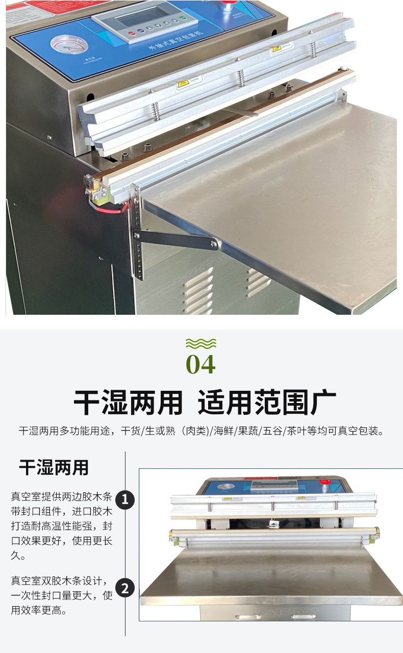 - 靈活性高:外抽真空包裝機不受包裝容器形狀和尺寸的限制。無論是大型的工業用真空袋,還是小型的家用真空袋,只要抽氣口能夠與抽氣嘴連接,就可以進行真空包裝。例如,在包裝大型的工業零部件或不規則形狀的工藝品時,外抽式的特點使得它能夠輕松應對,而內抽式真空包裝機可能會因為真空室尺寸的限制而無法完成包裝。