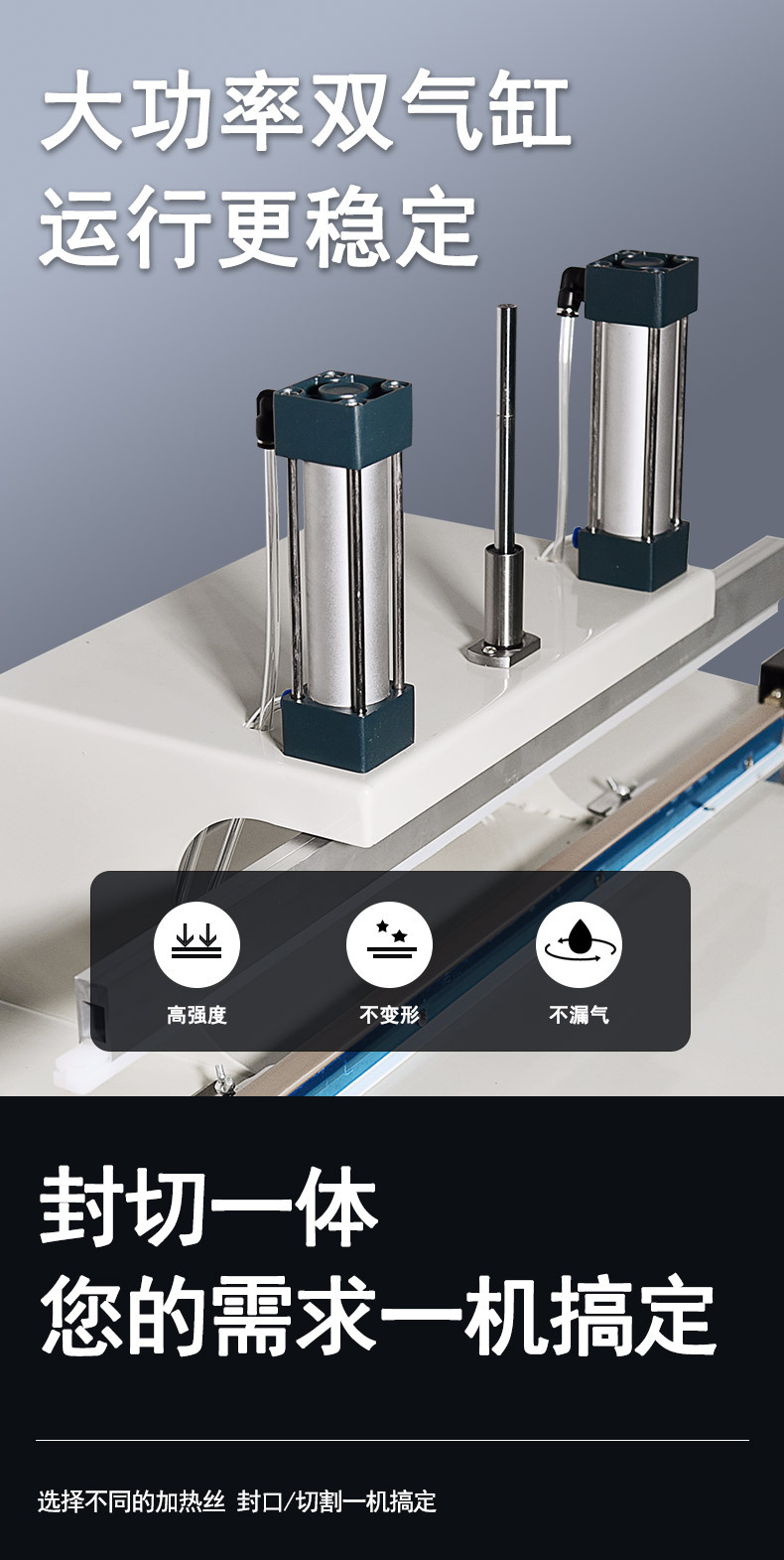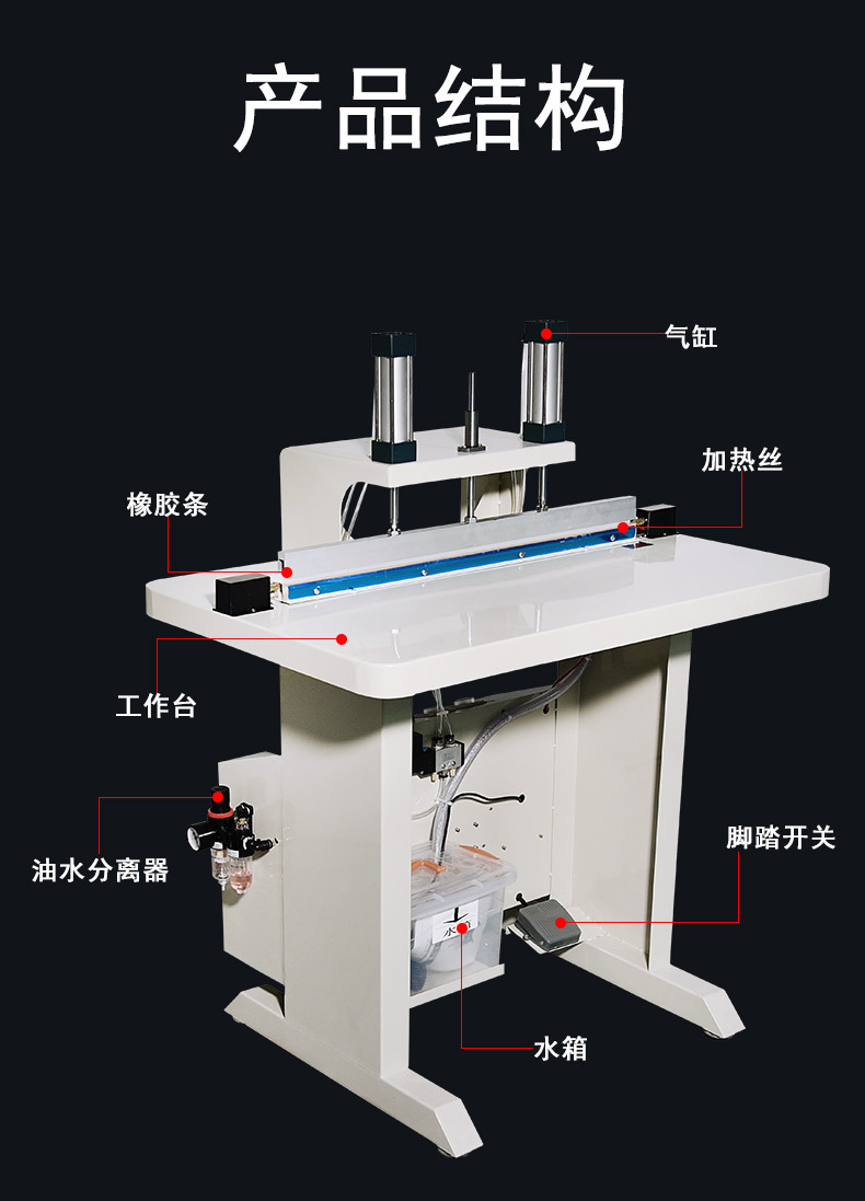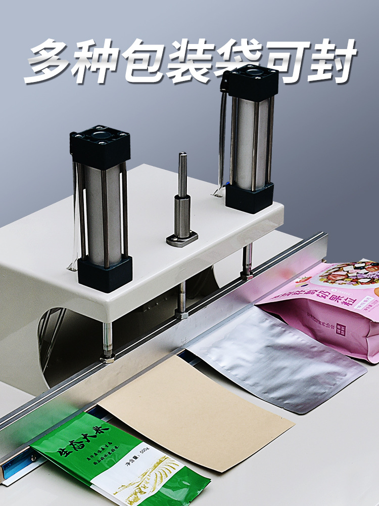 - 啟動封口:踩下腳踏開關(guān)或按下操作面板上的封口按鈕,封口壓頭在氣缸(或其他動力裝置)推動下下壓,包裝袋與加熱的封口條緊密貼合,封口處塑料受熱熔融;與此同時,水冷系統(tǒng)同步運行,帶走熱量促使封口快速冷卻定型。