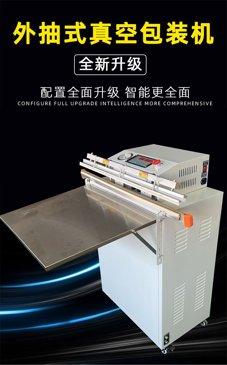 - 外抽式真空包裝機(jī):把包裝袋放在真空室外的工作臺(tái)上,通過(guò)抽氣嘴伸入包裝袋內(nèi)抽氣,同時(shí)利用熱封裝置對(duì)包裝袋進(jìn)行封口,無(wú)需將產(chǎn)品放入真空室。