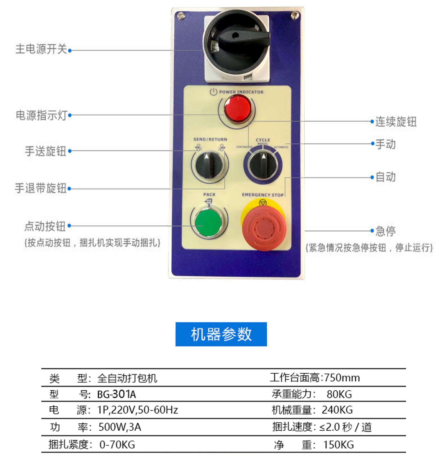 • 最大捆扎尺寸:標明機器能處理的最大長寬高尺寸,決定設備適用貨物范圍,如某型號最大捆扎尺寸為 800×600×600mm 。