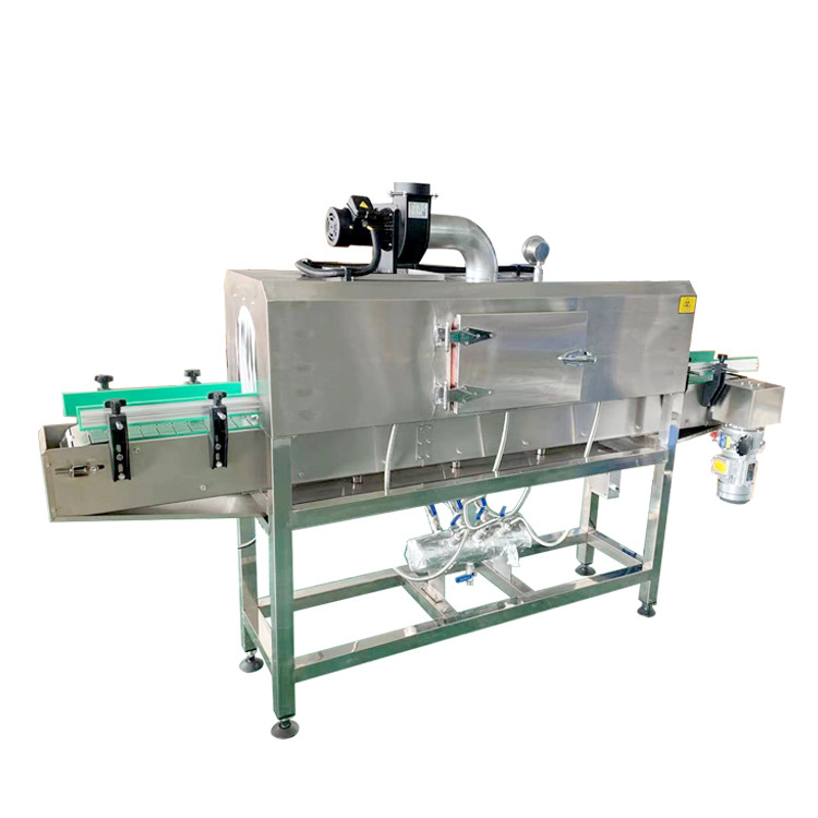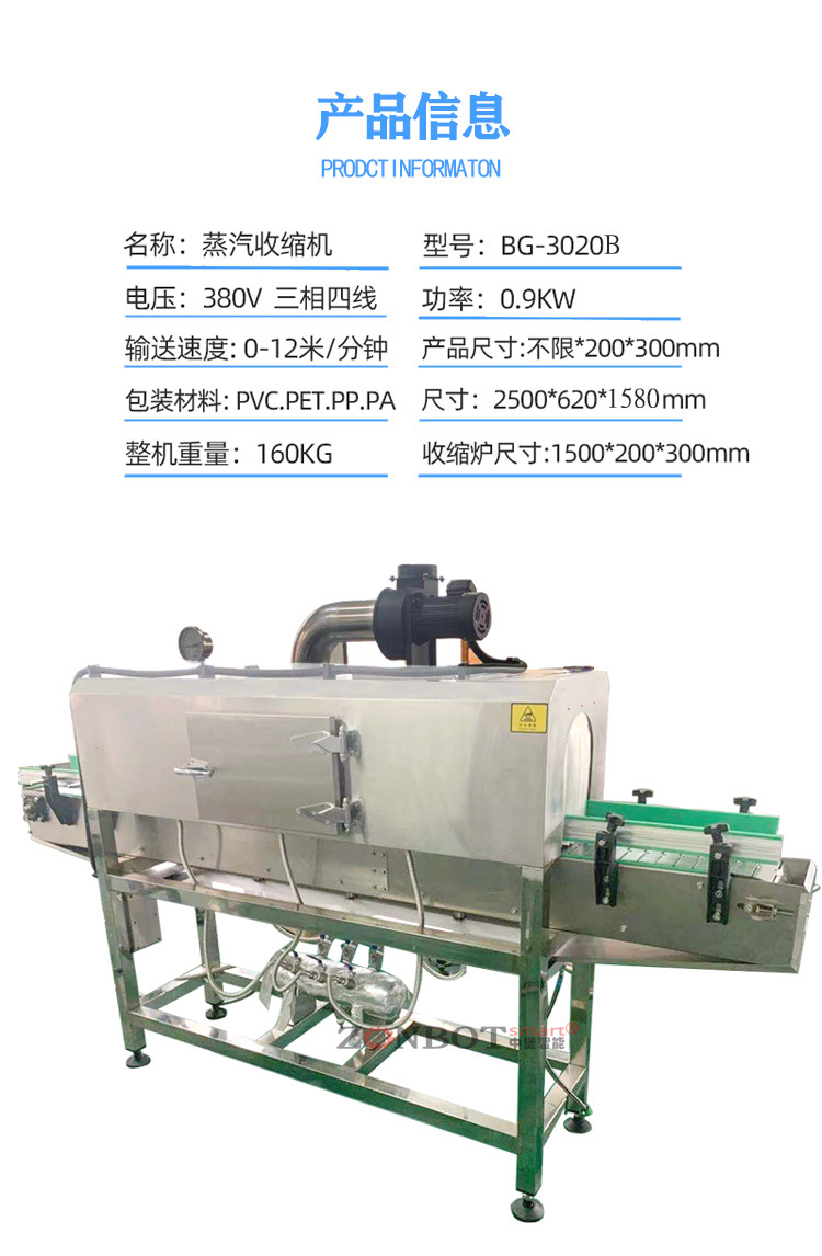 - 蒸汽收縮機(jī):通常有主副 2 個(gè)加熱器,可調(diào)節(jié)功率,輸送帶無(wú)級(jí)調(diào)速。有三層隔熱和防水設(shè)計(jì),多采用不銹鋼 304 制造。兩側(cè)噴管可多角度調(diào)整,前后有進(jìn)出口護(hù)罩,下部有接水盤4。