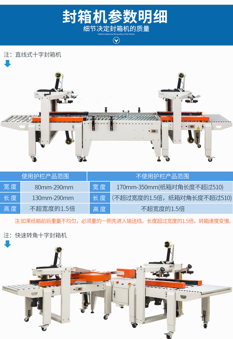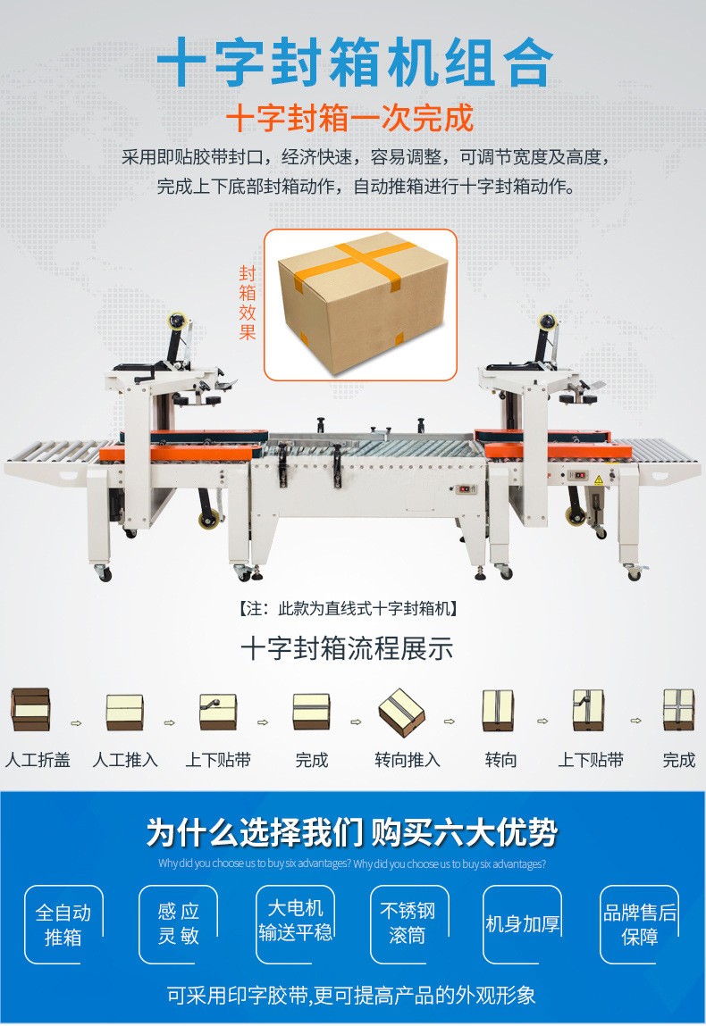 - 機(jī)器操作步驟少:十字封箱機(jī)操作相對簡單,工人只需將紙箱放置在指定位置或輸送帶上即可,機(jī)器會自動完成膠帶的切割、粘貼和撫平等復(fù)雜操作。一些先進(jìn)的十字封箱機(jī)還具備自動感應(yīng)紙箱尺寸、自動調(diào)整封箱參數(shù)的功能,進(jìn)一步減少了操作步驟。