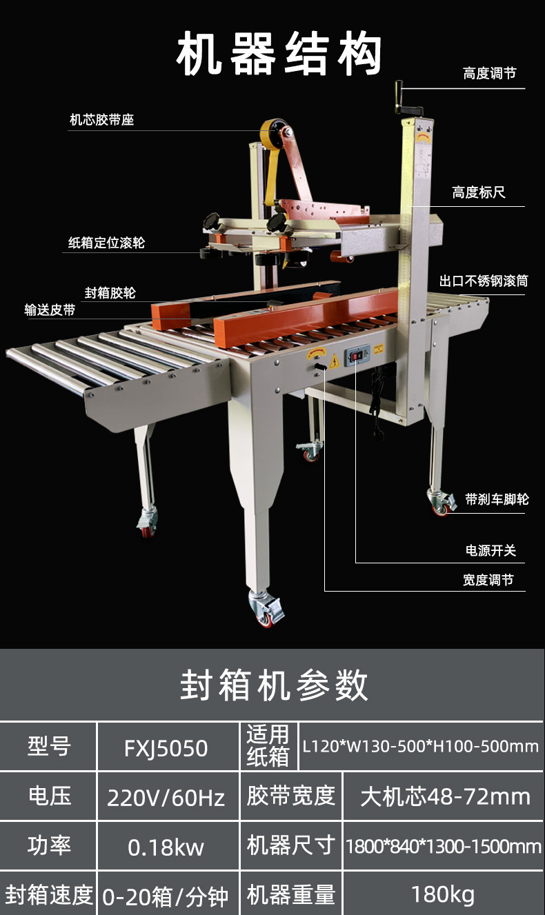 在參數(shù)設(shè)置方面,操作簡(jiǎn)單易懂。工人通過(guò)幾個(gè)明確標(biāo)識(shí)的按鍵,便能輕松對(duì)封箱速度、膠帶長(zhǎng)度等關(guān)鍵參數(shù)進(jìn)行調(diào)整。例如,封箱速度可依據(jù)實(shí)際生產(chǎn)需求,在操作面板上以遞進(jìn)式的數(shù)字調(diào)節(jié)方式,從每分鐘 10 箱逐步提升至每分鐘 60 箱不等,以適配不同產(chǎn)量要求的生產(chǎn)線節(jié)奏。膠帶長(zhǎng)度設(shè)置則通過(guò)數(shù)字輸入框,精確設(shè)定每次截取膠帶的長(zhǎng)度,確保既不浪費(fèi)膠帶,又能完全覆蓋紙箱封口。