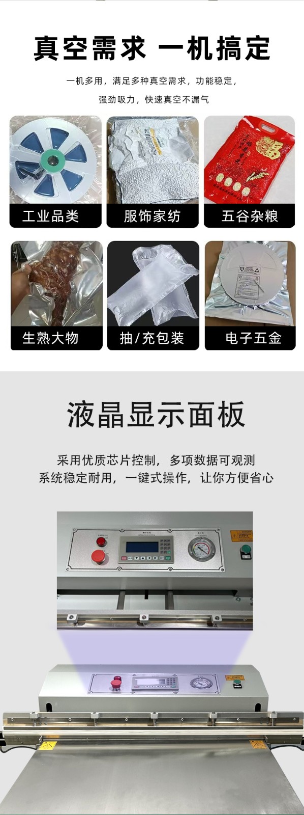 - 產(chǎn)品類型:不同的產(chǎn)品對(duì)包裝有不同的要求。如食品中的海鮮、水果、茶葉等,需要真空包裝以防止氧化變質(zhì)、延長(zhǎng)保質(zhì)期;電子產(chǎn)品則主要是為了防潮、防氧化變色。如果產(chǎn)品是液體或含有液體,要選擇具有防漏功能的包裝袋,并且機(jī)器的封口處需能確保密封4。對(duì)于形狀不規(guī)則或特大件的物品,外抽式真空包裝機(jī)更為適合,因其不受被包裝物尺寸的限制。