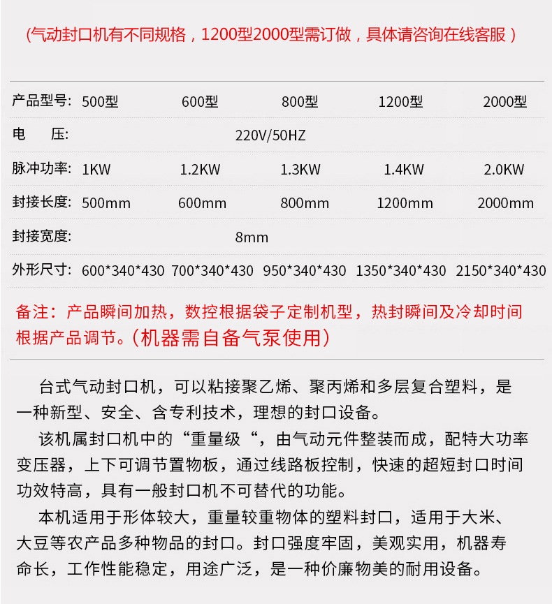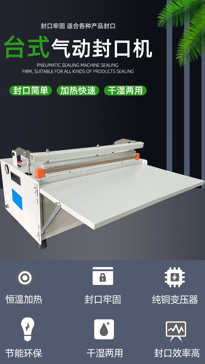 - 設備性能:優質的臺式氣動封口機配備高性能的氣動系統和加熱系統,能夠實現快速的封口動作和穩定的溫度控制。例如,一些高端型號采用先進的氣動元件,響應速度快,氣缸運動平穩,可有效縮短封口周期。同時,高效的加熱系統能在短時間內達到并保持合適的封口溫度,提高每次封口的效率。