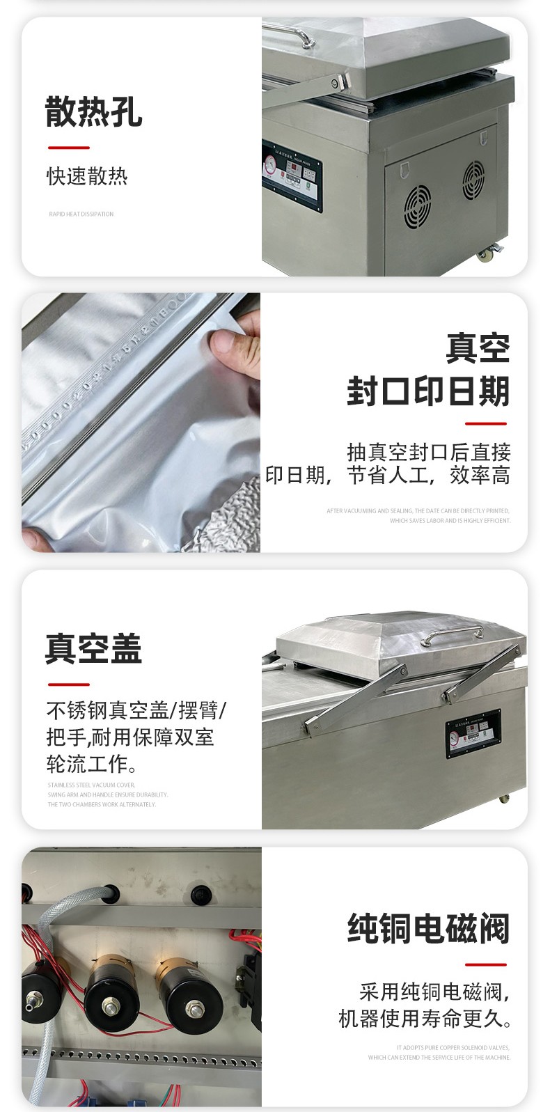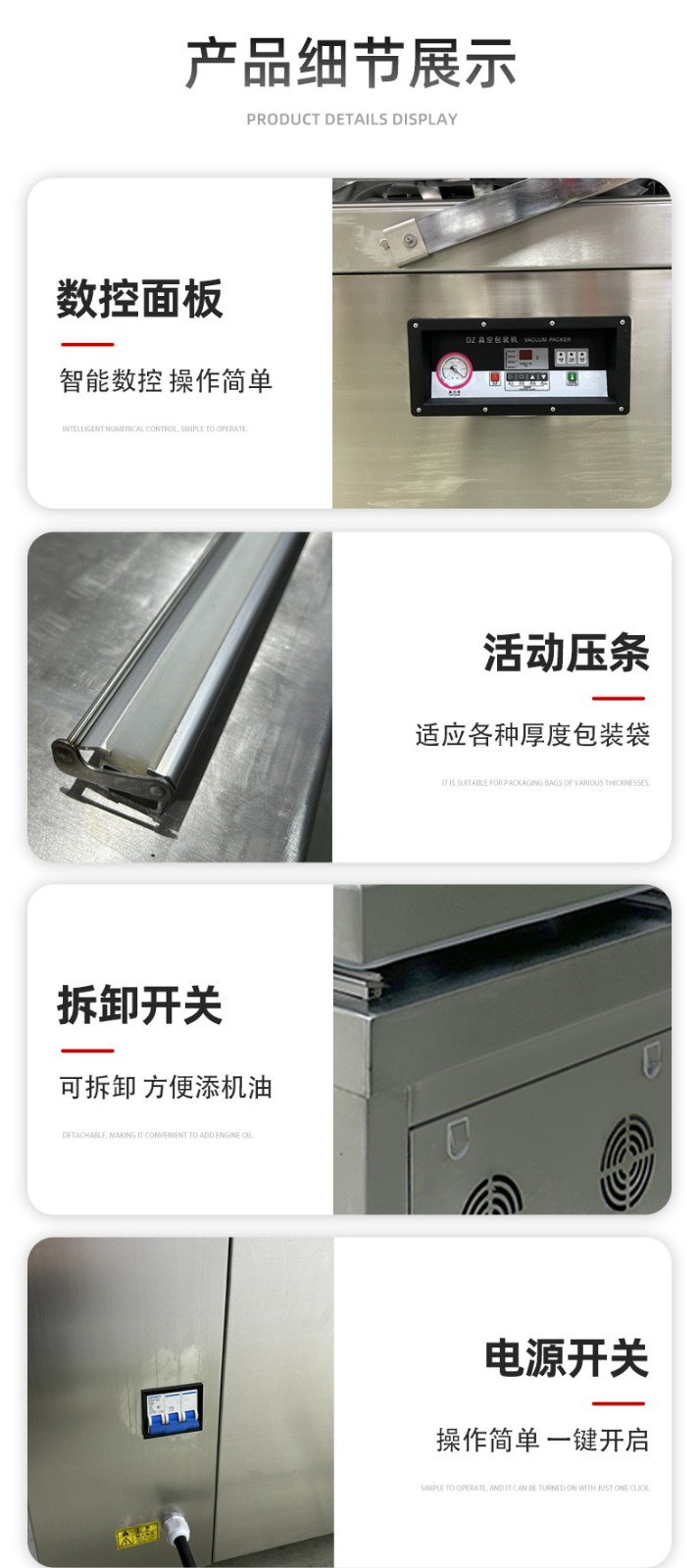 - 按下啟動(dòng)按鈕,設(shè)備開(kāi)始工作。首先真空泵啟動(dòng),對(duì)真空室進(jìn)行抽真空操作,當(dāng)真空度達(dá)到設(shè)定值后,抽真空停止,熱封裝置開(kāi)始工作,對(duì)包裝袋進(jìn)行封口。熱封完成后,真空室恢復(fù)常壓,此時(shí)可以打開(kāi)真空室門(mén),取出包裝好的產(chǎn)品。