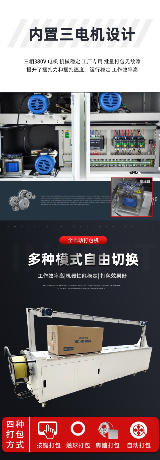 - 全自動打包機:自動化程度高,能自動完成送帶、捆扎、收緊、封口、切斷等一系列打包流程,只需將物品放置在指定位置,按下啟動按鈕,機器就會按照預設程序完成整個打包過程,無需人工干預每個步驟。