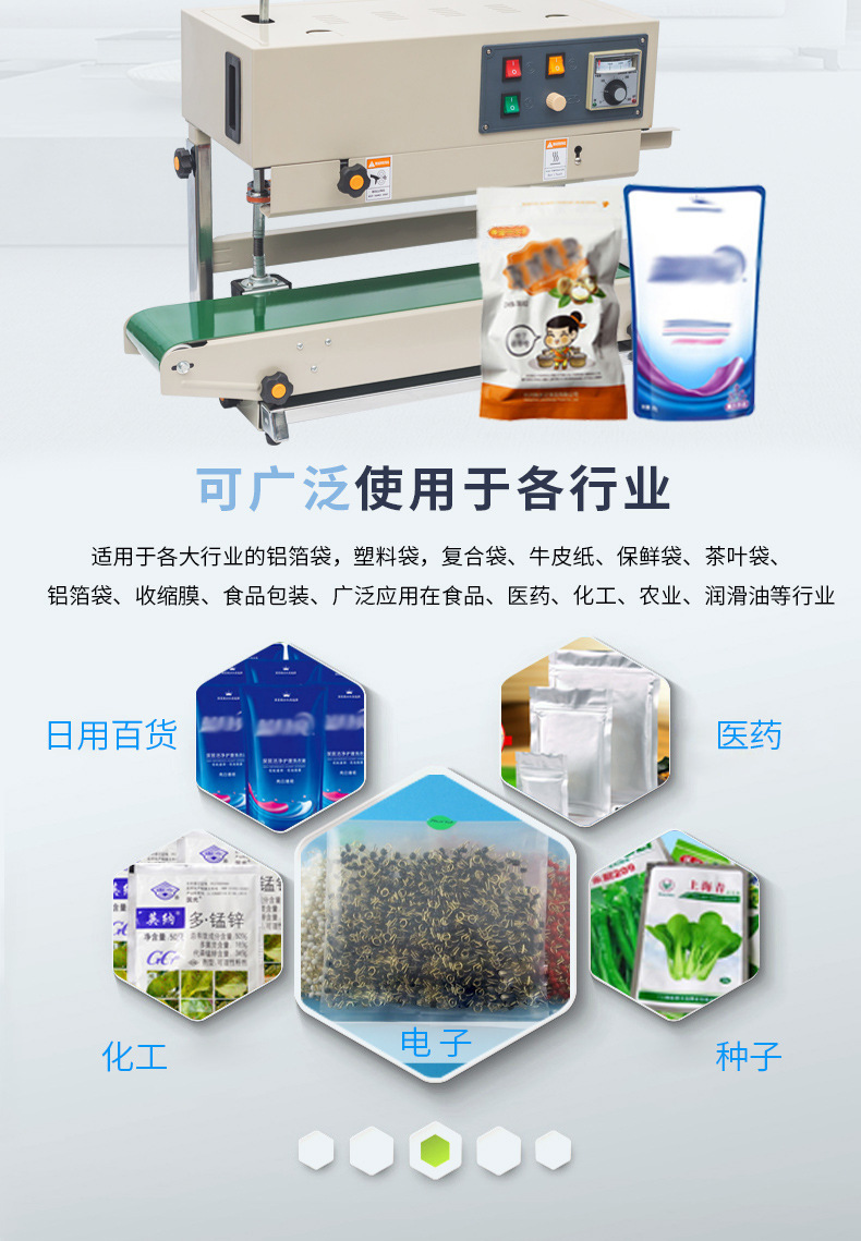 - 適用范圍廣:適用于各種塑料薄膜的封口及制袋,如鋁箔袋、塑料袋、復合袋等,廣泛應用于食品、醫藥、日化、化工等行業,可對液體、膏體、顆粒、粉狀等不同形態的物品進行包裝封口1。