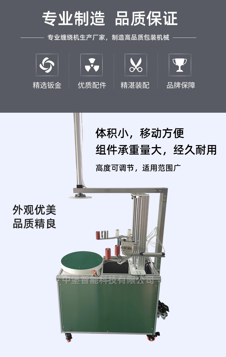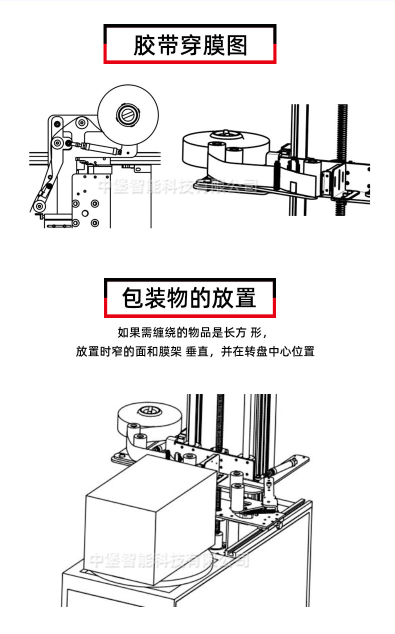 纏膠帶機(jī)主要通過(guò)膠帶在機(jī)器上的旋轉(zhuǎn)以及膠帶張力和切刀的協(xié)同作用