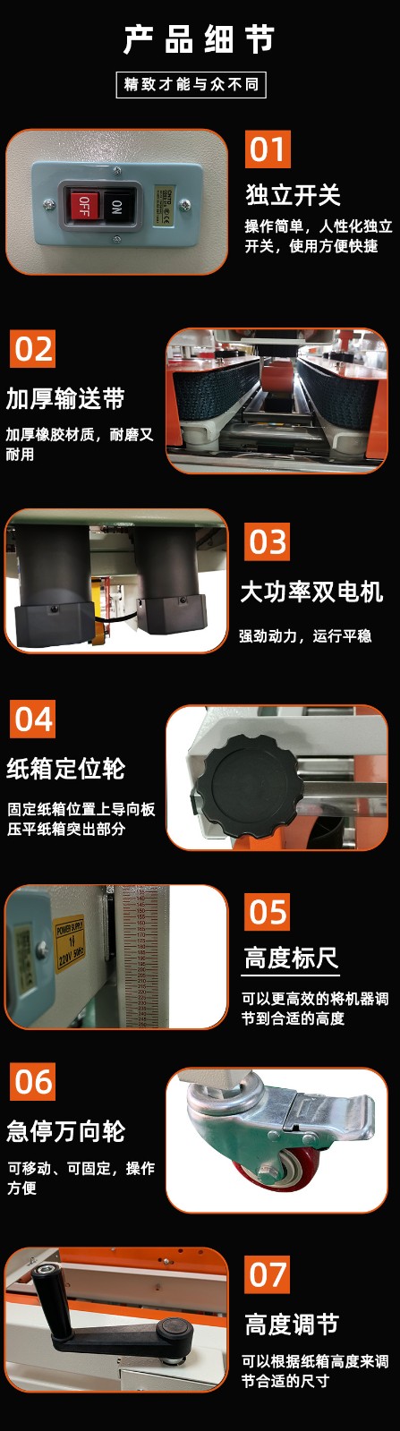 適用范圍 廣泛應用在家用電器、紡織、食品、百貨、醫(yī)藥、化工等行業(yè)。產(chǎn)品介紹 快速簡單的調(diào)整兩個手動輪子,完成機器紙箱尺寸要求的設置.頂部和底部是同步封起來的(頂部已經(jīng)封起來的紙箱必須引入到機器中去)