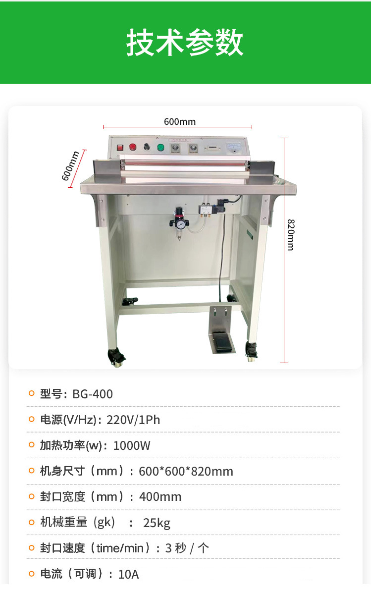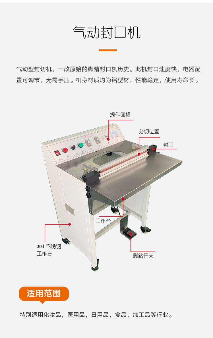 機(jī)器采用的是不銹鋼材料制成,利用壓縮空氣作為動(dòng)力,封口的壓力可以進(jìn)行調(diào)試,根據(jù)產(chǎn)品的不同選擇合適的壓力指數(shù)。設(shè)備穩(wěn)定可靠,可以手動(dòng)操作也可以腳踏操作,簡(jiǎn)單方便。