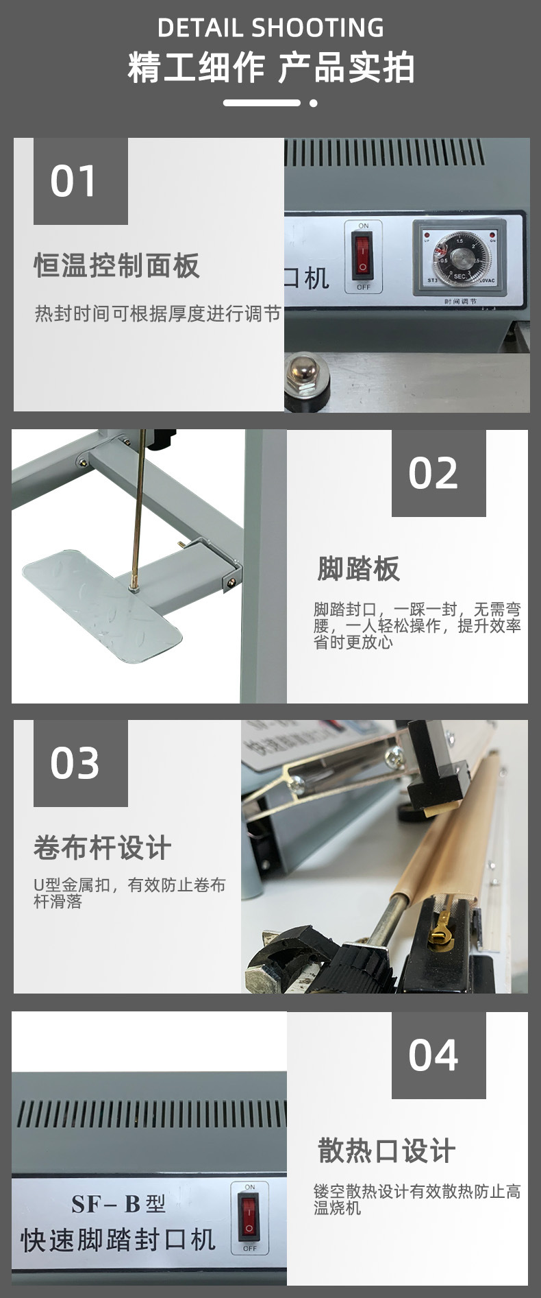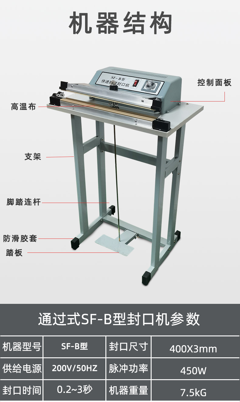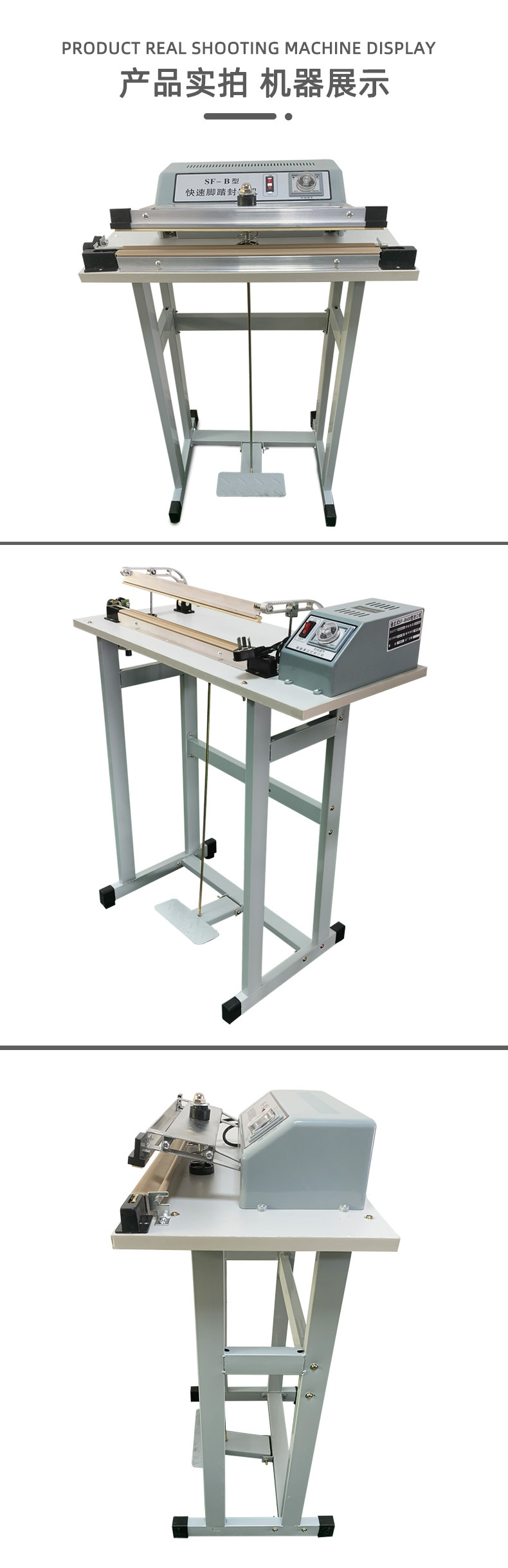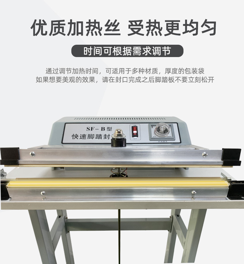 腳踏封口機是一種理想的封口設備,?適用于各種塑料袋薄膜的封口及制袋。?它特別適用于醫藥、?農藥、?食品、?日化、?潤滑油等行業的鋁箔袋、?塑料袋、?復合袋的封口。?這種設備利用電氣脈沖技術,?能夠顯著縮短封口時間,?從原來的2-4秒縮短至0.2秒,?具有投資少、?效益高、?封口長度長、?操作簡單等特點。?因此,?腳踏封口機被廣泛應用于食品、?醫藥、?土特產、?電器軟件、?工廠、?商店、?服務行業等領域,?成為這些行業中不可或缺的封口設備