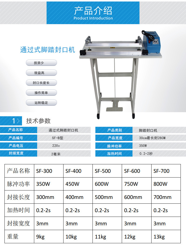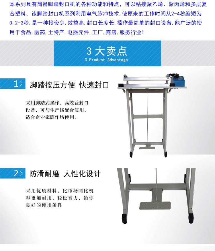 腳踏封口機(jī)適用于POF膜、包裝袋、收 縮膜、餐具袋。也可用作封切機(jī)(只要通過更換封切電熱絲即可). 結(jié)構(gòu)簡(jiǎn)單,操作方便,價(jià)格低廉