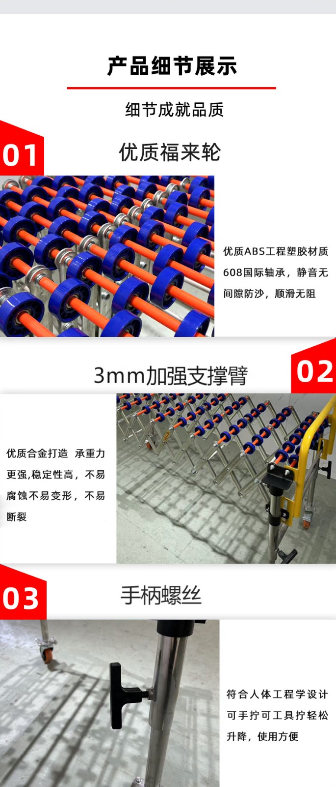 滾輪:這是核心部件,一般由金屬或塑料制成。金屬滾輪(如碳鋼、不銹鋼滾輪)具有較高的強度和承載能力,適用于較重物品的輸送;塑料滾輪(如聚氨酯滾輪)則具有較好的耐磨性和較低的噪音特性,常用于對噪音要求較高的場合。滾輪的直徑和寬度會根據輸送物品的大小