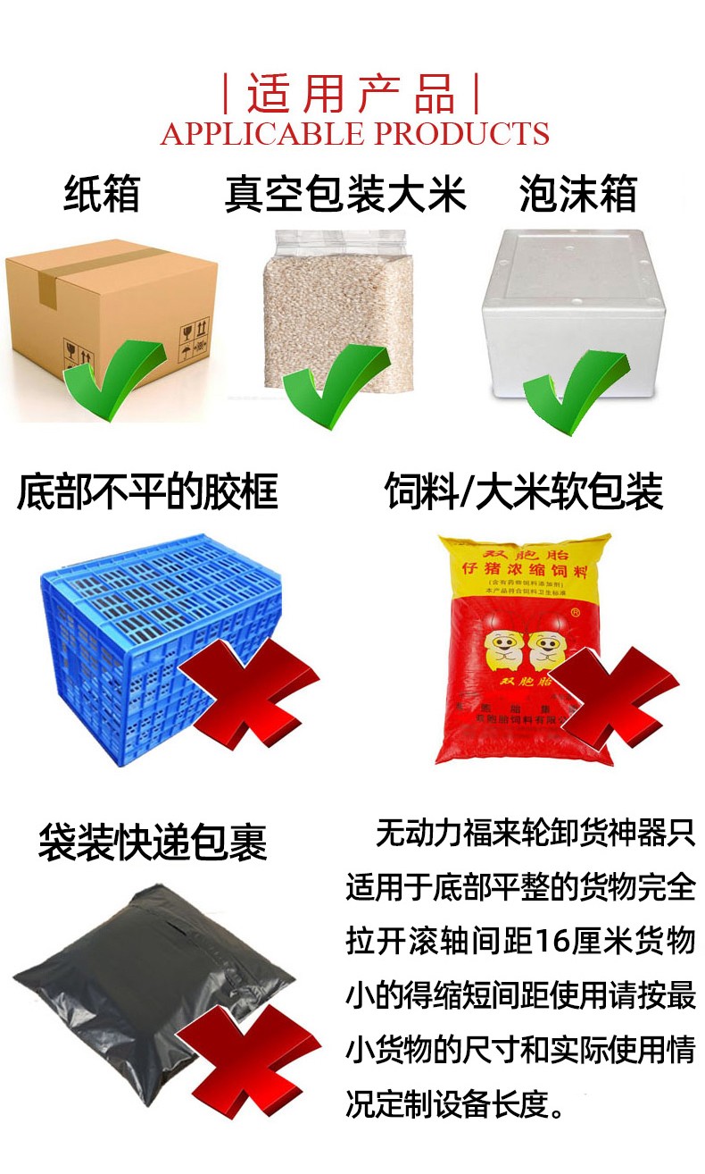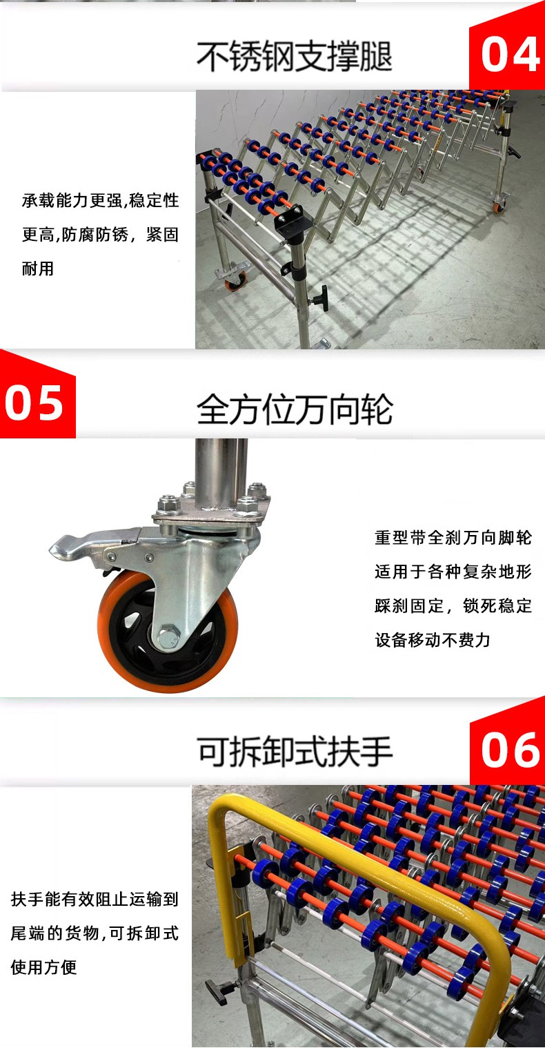 - 通用性強:能夠輸送各種形狀的物體,只要物體底部相對平整,就可以在滾輪上滾動輸送,無論是方形的箱子、圓形的桶還是其他不規則形狀的物品(在一定范圍內)。