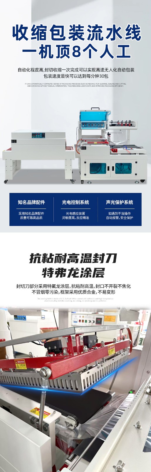 全自動 L 型封切熱收縮包裝機(jī)是一款集 “封切套膜” 與 “熱收縮定型” 于一體的自動化包裝設(shè)備,因封切機(jī)構(gòu)呈 “L” 形而得名,廣泛應(yīng)用于食品、醫(yī)藥、電子、日化等行業(yè),核心優(yōu)勢是包裝效率高、密封性好、外觀規(guī)整,能快速實現(xiàn)產(chǎn)品的單件或集合包裝,尤其適配規(guī)則形狀(如長方體、圓柱體)及中小型尺寸產(chǎn)品。下面從核心工作原理、關(guān)鍵結(jié)構(gòu)組成、核心優(yōu)勢、適用場景、選型與操作注意事項五個維度,全面介紹該設(shè)備: