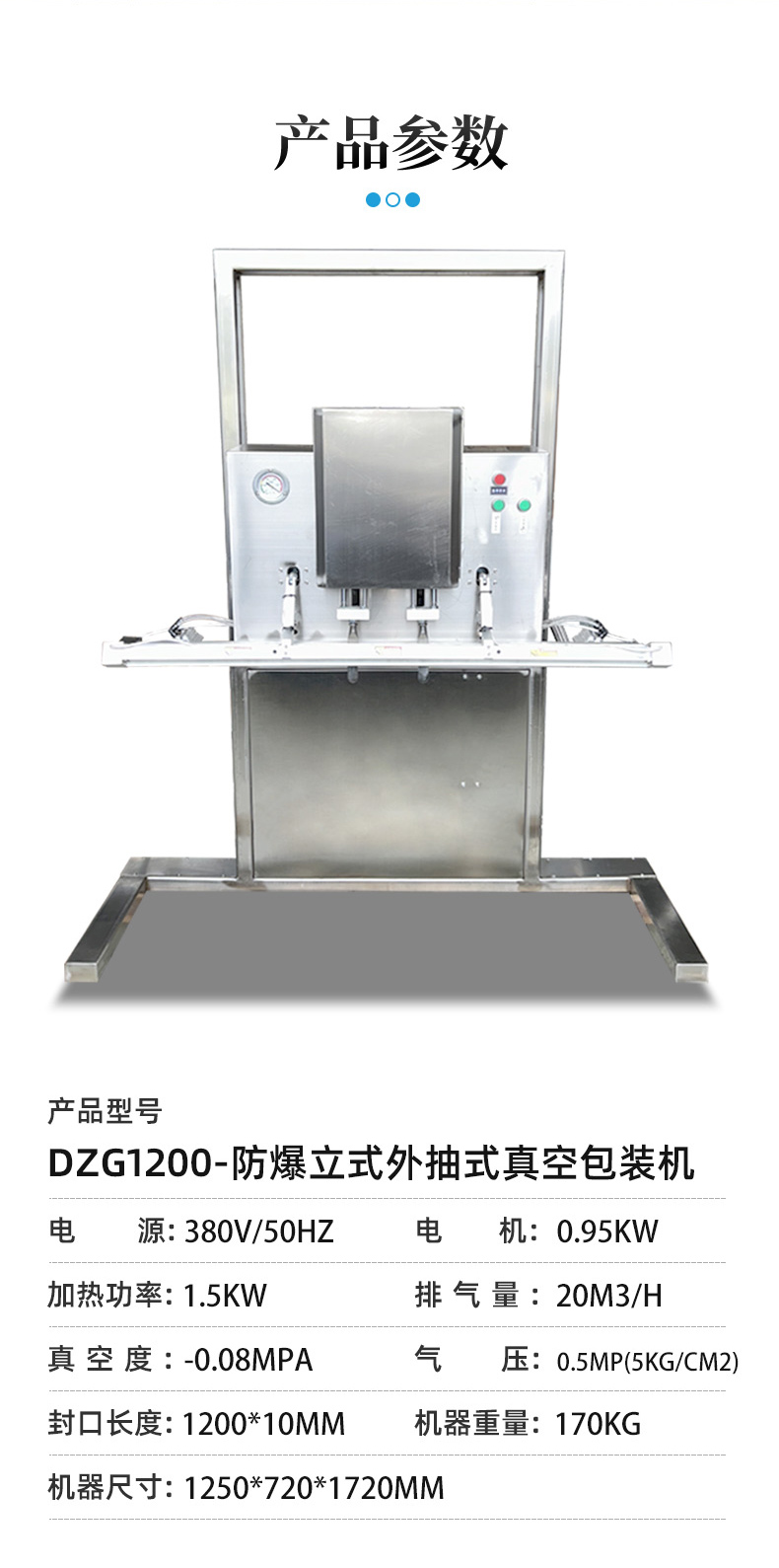 防爆立式外抽真空包裝機是在普通立式外抽真空包裝機的基礎上,采用了防爆技術,使其能夠在存在易燃易爆氣體、粉塵等危險環境中安全運行的包裝設備,主要用于化工、醫藥、制藥、民爆、實驗室、航天航空等領域中易燃易爆物品的包裝封口、儲存。