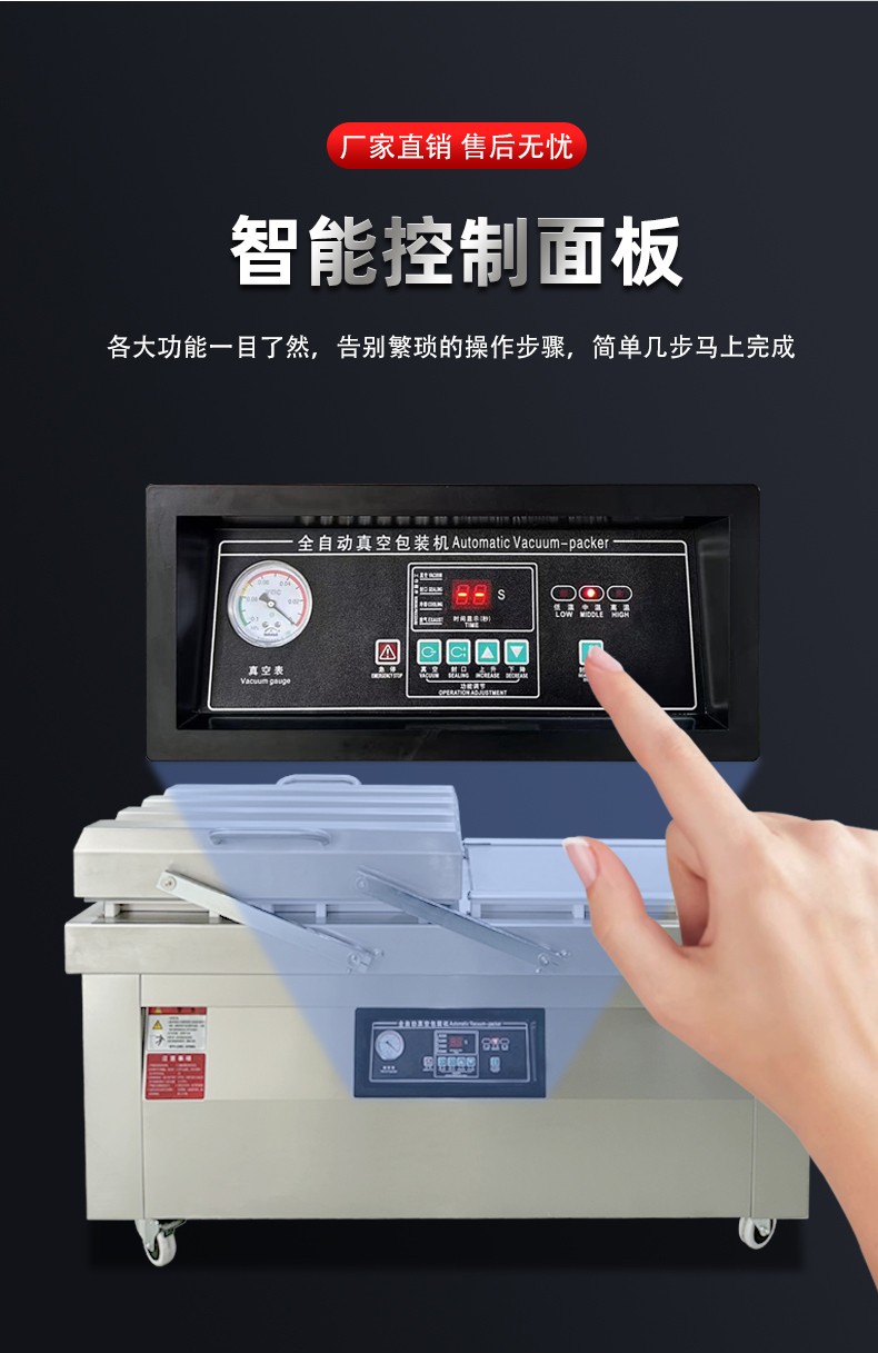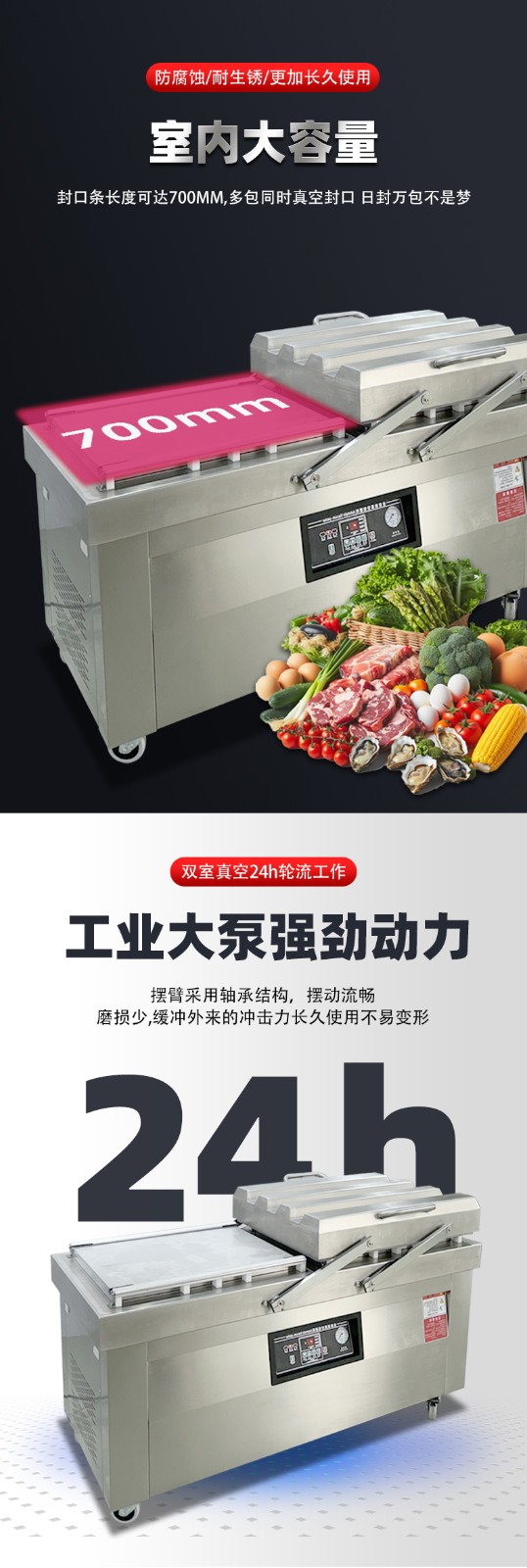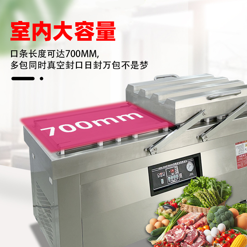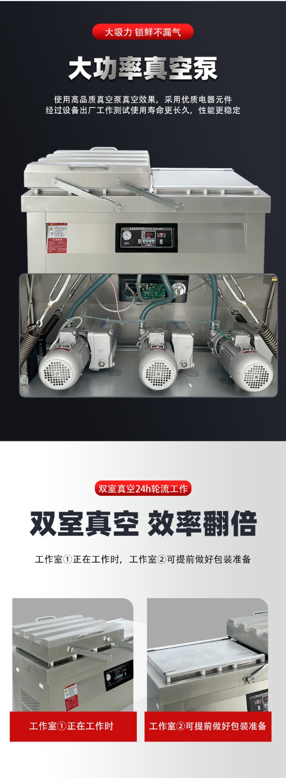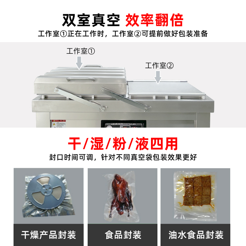 雙室真空包裝機(jī)通過 “雙真空室輪換作業(yè)” 實(shí)現(xiàn)抽真空與裝袋無縫銜接,核心是利用兩個(gè)獨(dú)立真空室的 “時(shí)間差并行操作”,讓設(shè)備在同一周期內(nèi)同時(shí)完成 “抽真空密封” 和 “人工 / 自動(dòng)裝袋”,徹底消除單室機(jī)型 “抽真空時(shí)無法裝袋” 的等待間隙,大幅提升作業(yè)效率。其具體運(yùn)作邏輯和優(yōu)勢可拆解為以下 3 點(diǎn):