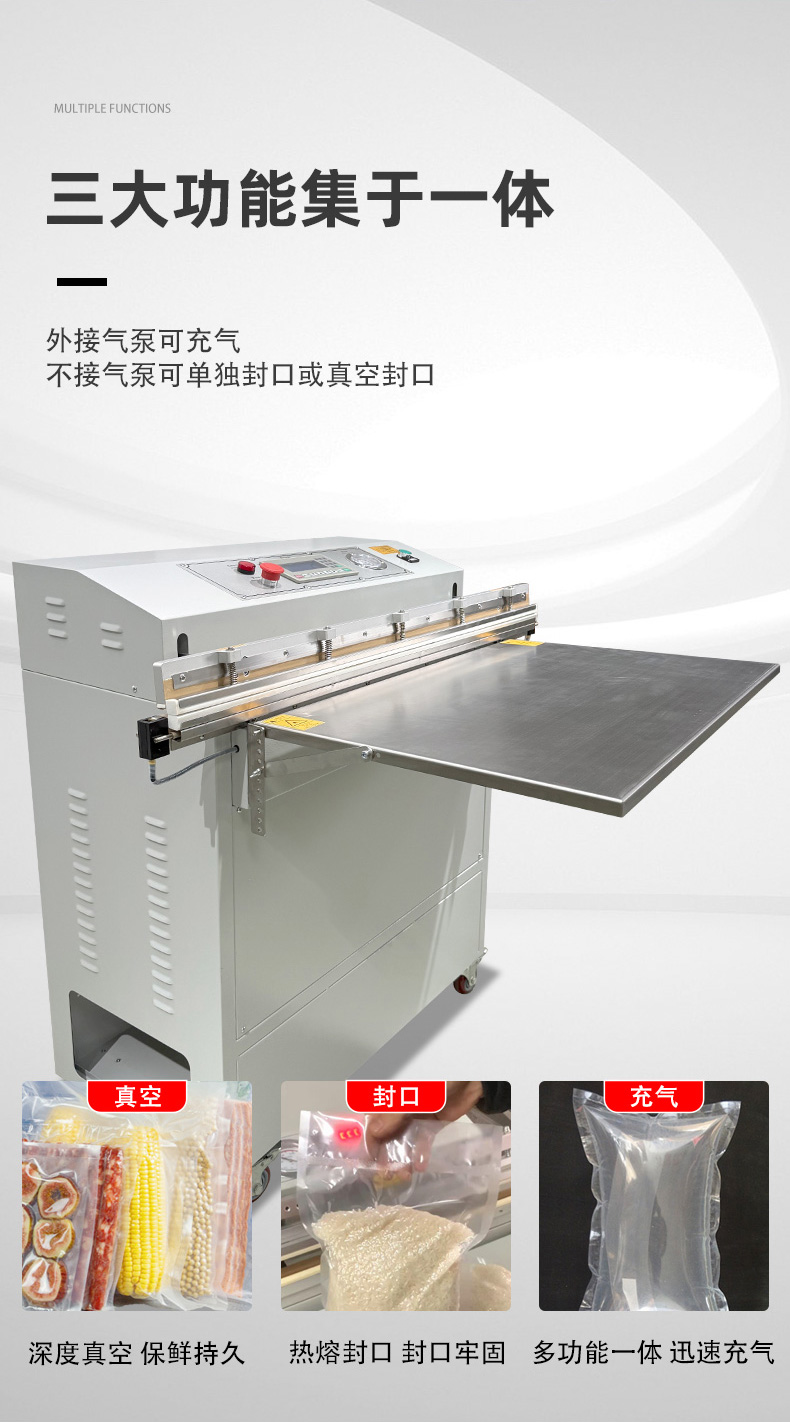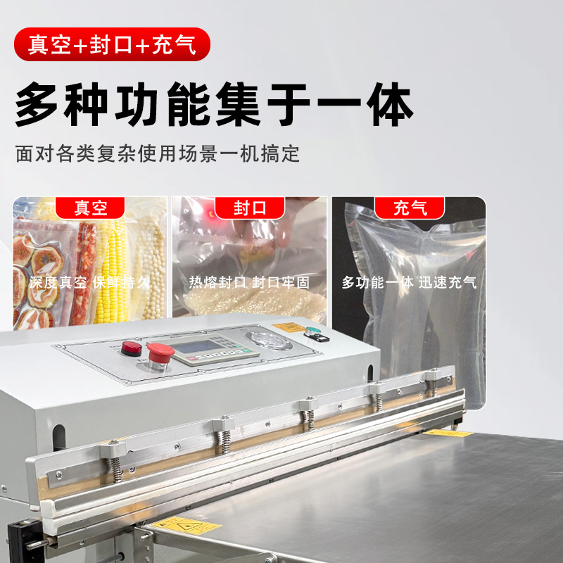 - 適配多場景:支持 PE、PA、鋁箔等多種包裝材料,可切換 “真空封口”“充氣保鮮” 兩種模式,兼顧工業(yè)防銹與食品保鮮需求。